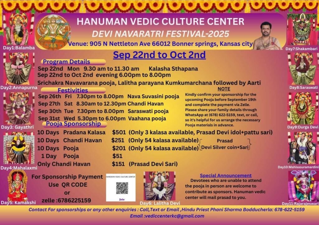 Hanuman Vedic Culture Center invites you and your family to celebrate the Devi Navaratri Festival 2025 in Kansas City. This sacred 10-day festival will be filled with daily poojas, devotional rituals, and traditional celebrations, creating an opportunity for the community to come together in prayer and devotion.